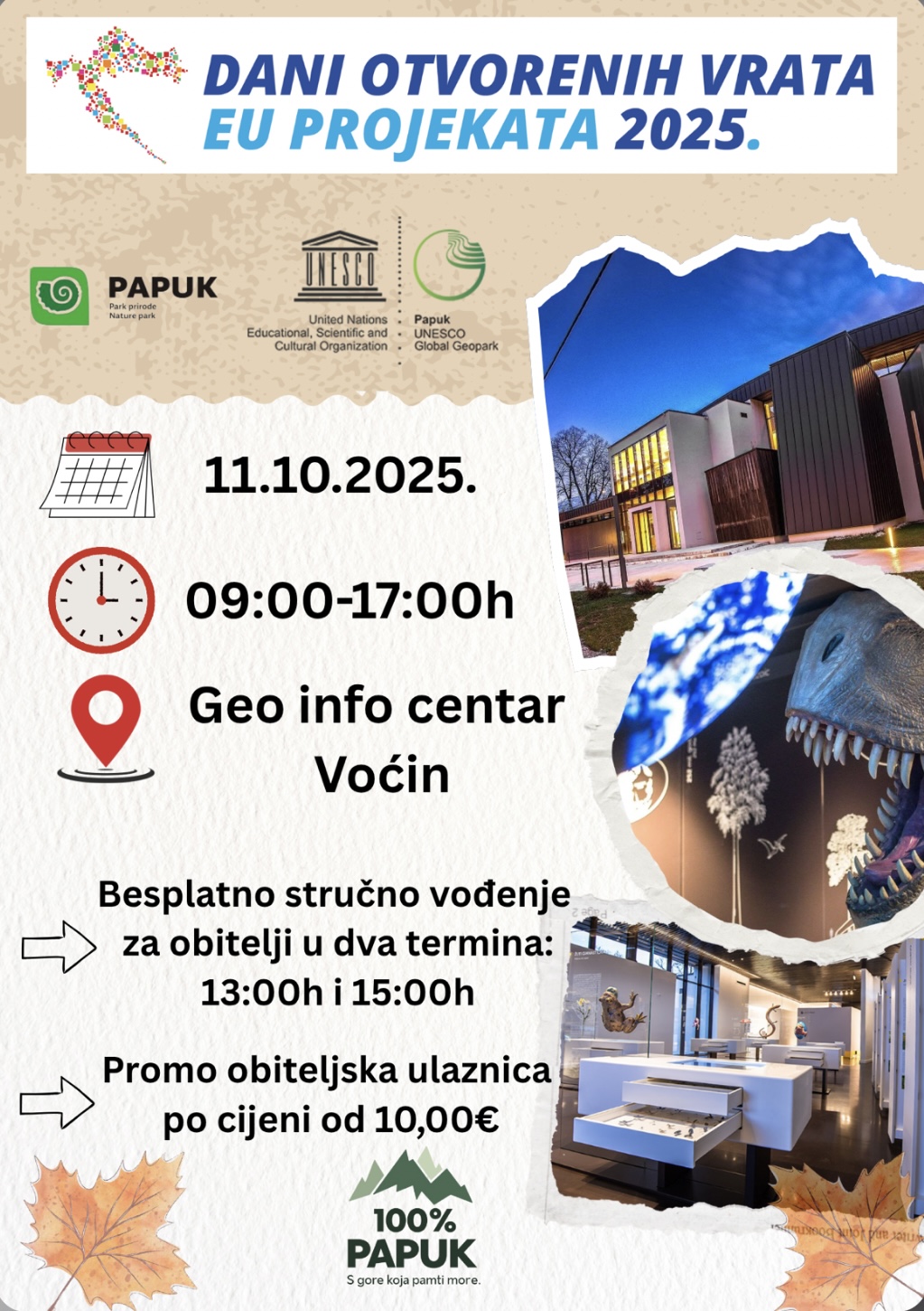 U sklopu „Dana otvorenih vrata EU projekata“ 2025. godine Geo Info Centar otvara svoja vrata svim posjetiteljima kroz posebno organizirano besplatno stručno vođenje. Posjetitelji će imati priliku upoznati se s rezultatima projekta „Geo priče UNESCO geoparka“, koji je doprinio razvoju i promociji jedinstvene prirodne i kulturne baštine našeg kraja.